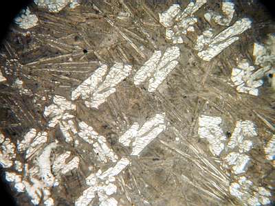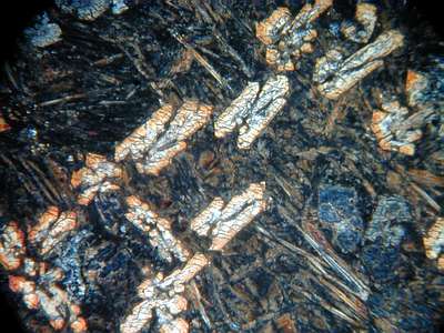 Скелетные кристаллы клинопироксена и структура спинифекс в основной массе коматиитов (Лев-гора, Ветренный пояс, Карелия). Фото П.Л.Тихомирова |
