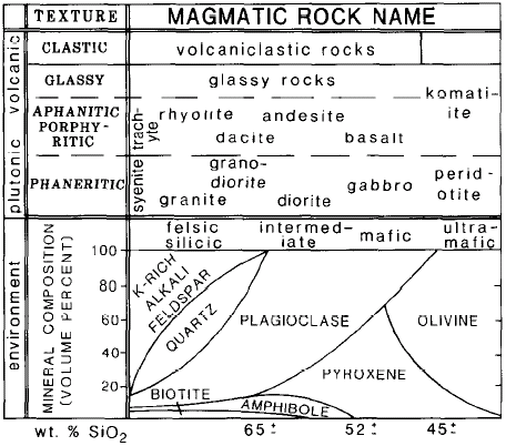 Дополнительная классификационная диаграмма, показывающая примерное количество породообразующих минералов в породах различной кремнекислотности. |