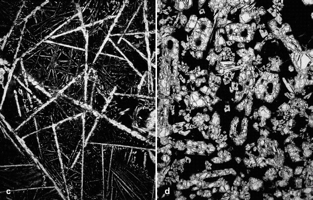 Структуры коматиитов. Фотографии взяты из статьи [Puchtel et al.,1996]. На фото "C" показан оливиновый спинифекс (ширина фотографии 11.6 мм), на фото "D" - структура кумулятивного оливинового слоя (ширина фотографии 5.8 мм). |